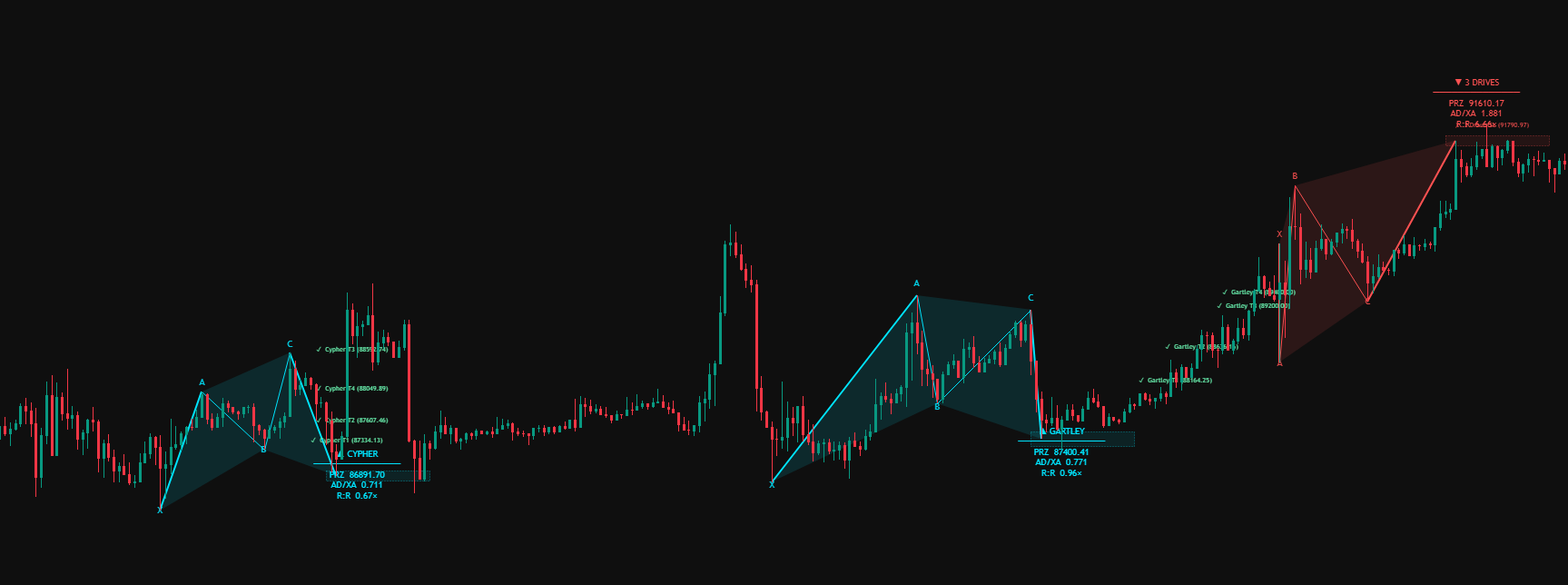 Scan high probability harmonic reversals with PRZ zones, target projections, stop loss levels, live dashboard tracking, and configurable alerts.
